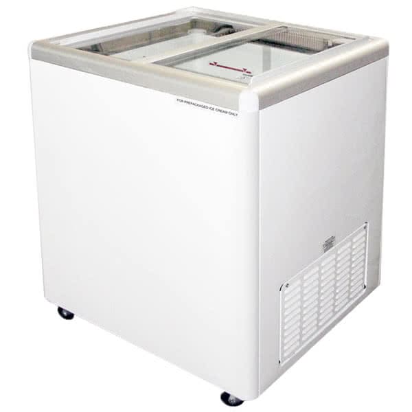 Horizontal Display Freezer, 8 cu. ft., flat glass lids, optional can holders are available but are not included, white galvanized steel interior liner, dual condensing system, casters (2 locking), +5°F to -15°F temperature range, R-134a refrigerant, 33.25″L x 24.5″D x 34″H, 3.9 amps, 1/5 HP, 115v/60/1ph