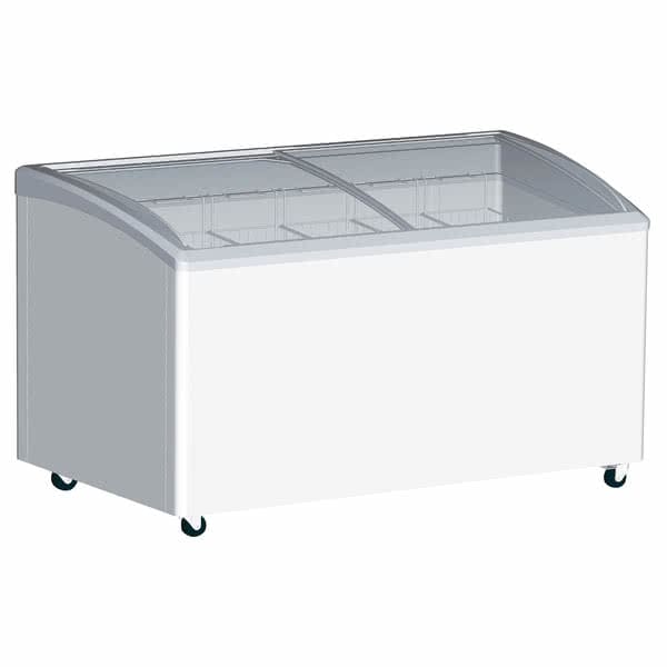 Ice Cream Display Freezer, horizontal, 14.3 cu ft, curved sliding glass lids, 5 baskets, cold wall evaporator, adjustable thermostat, LED lighting, prepainted galvanized steel interior, single layer heat re?ective lids, 48.75″L x 27.25″D x 33.5″H, 1.9 amps, 3.0 KWh/24hr, 3/8 HP, 115v/60/1ph