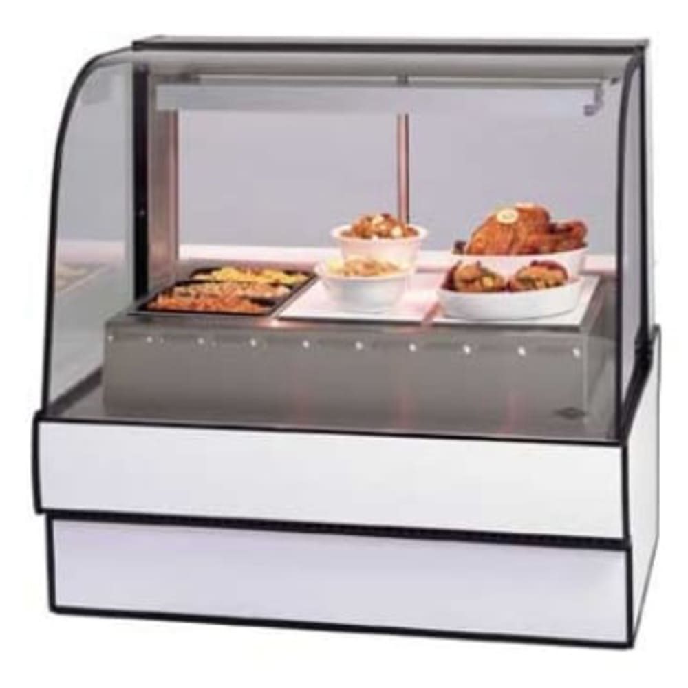 Curved Glass Hot Deli Case, 50.13″W x 35.31″D x 48″H, wet or dry heat, (3) wells, independently controlled stainless steel heating wells each with a calrod heating element, top-mounted full-length infrared heater, curved thermopane tilt-front glass, forced air front-glass defogger, LED top light, glass sliding rear doors with moisture vents, stainless steel deck, tempered glass ends, removable wrapping board, designed for continuous lineups, choice of laminate, black trim, drain not needed, UL, UL EPH CLASSIFIED