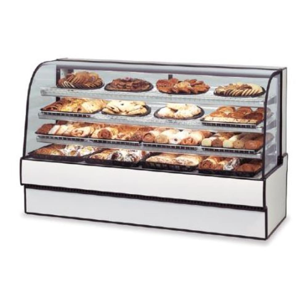 Curved Glass Refrigerated Bakery Case, 77.13″W x 35.31″D x 42″H, self contained refrigeration with condensate evaporator, adjustable temperature control, curved thermopane tilt-front glass, 3000K LED top light & lighted shelves, (2) tiers of adjustable white wire shelves, glass sliding rear doors, white interior, tempered glass ends, white laminate with black trim, designed for continuous lineups, 3/4 HP, UL, UL EPH CLASSIFIED, DOE 2017 Compliant
