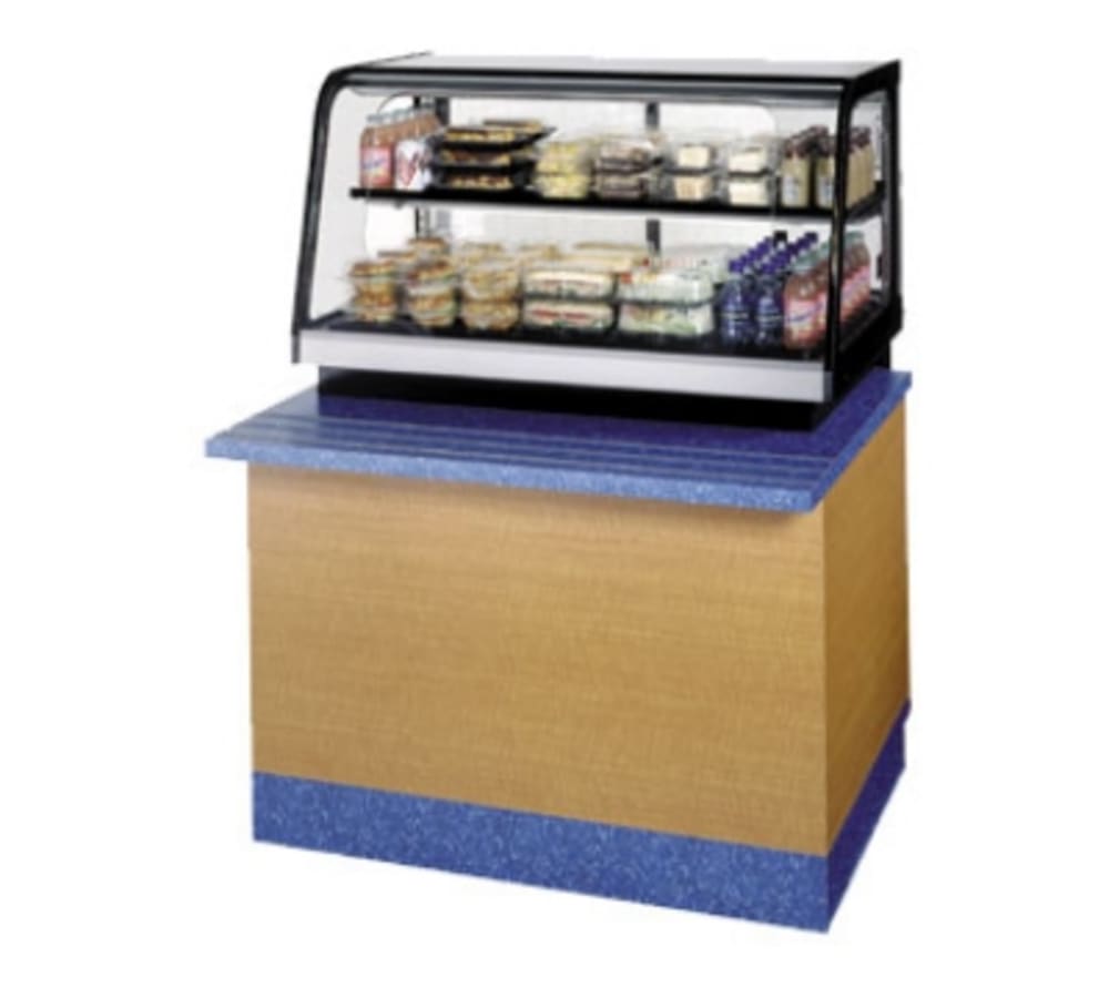 Counter Top Refrigerated Self-Serve Bottom Mount Merchandiser, 48″W x 30″D x 40.5″H, self contained refrigeration with condensate evaporator, adjustable temperature control, tempered front glass with self-serve cut out, LED top light with lighted shelf, adjustable black metal shelf, removable black display deck, black painted metal & stainless construction with black trim, removable sliding glass rear doors, clear end panels, recessed 3″ in theCounter, cord & plug, UL, UL EPH CLASSIFIED