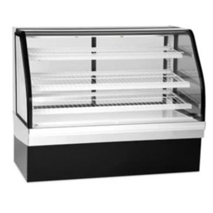 Elements Non-Refrigerated Bakery Case, 77.13″W x 35.31″D x 48″H, curved thermopane tilt-out front glass, 3000K LED top & shelf lights, (3) tiers of adjustable white wire shelves, removable sliding rear doors, white display deck, stainless steel top & sides, black base, cord & plug, 120v/60/1-ph electrical, cULus, UL EPH Classified, Made In USA, DOE 2017 Compliant