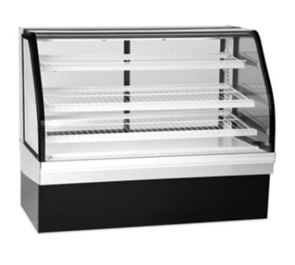 Elements Refrigerated Bakery Case, 50.13″W x 35.31″D x 48″H, self contained refrigeration with condensate evaporator, adjustable temperature control, curved thermopane tilt-out front glass, 3000K LED top & shelf lights, (3) tiers of adjustable white wire shelves, removable sliding rear doors, white display deck, stainless steel top & sides, black base, 1/2 HP, 120v/60/1-ph electrical, cord & plug, cULus, UL EPH Classified, Made In USA, DOE 2017 Compliant
