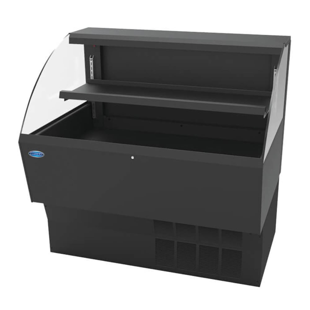 Elements Low Profile Self-Serve Refrigerated Merchandiser, 46.6″W x 34″D x 46″H, self contained refrigeration with PTC condensate evaporator, adjustable temperature control, energy saving night curtain, 3500K LED horizontal & top light, (1) tier adjustable solid black metal shelf, black display deck & black interior, black trim, clear Acrylic ends, 1/3 HP, 120v/60/1-ph electrical, cord & plug, cULus, UL EPH Classified, Made In USA, DOE 2017 Compliant