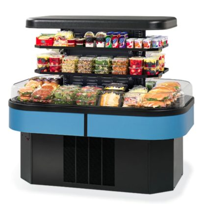 Specialty Display Island Self-Serve Refrigerated Merchandiser, 60″W x 40″D x 60″H, self contained refrigeration with condensate evaporator, adjustable temperature control, 3500K LED top & undershelf lighting, (3) tiers of adjustable black metal shelves, curved air deflector, black metal base, black interior & canopy, choice of laminate, 1-1/2 HP, cULus, UL EPH Classified, Made In USA, DOE 2017 compliant