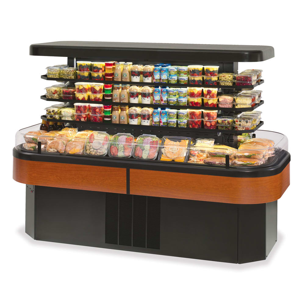 Specialty Display Island Self-Serve Refrigerated Merchandiser, 84″W x 40″D x 60″H, self contained refrigeration with condensate evaporator, adjustable temperature control, 3500K LED top & undershelf lighting, (3) tiers of adjustable black metal shelves, curved air deflector, black metal base, black interior & canopy, choice of laminate, 1-1/2 HP, cULus, UL EPH Classified, Made In USA, DOE 2017 compliant