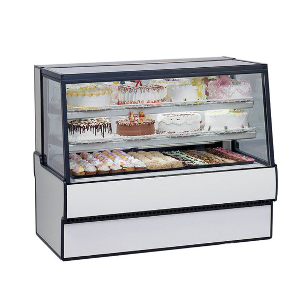 High Volume Non-Refrigerated Bakery Case, 50-1/8″W x 35-5/16″D x 42″H, sloped tilt-front glass, LED top light & lighted shelves, (2) tiers of adjustable white wire shelves, glass sliding rear doors, white interior, tempered glass ends, black laminate with black trim, designed for continuous lineups, cULus, UL EPH Classified, Made In USA, DOE 2017 compliant