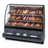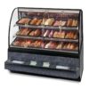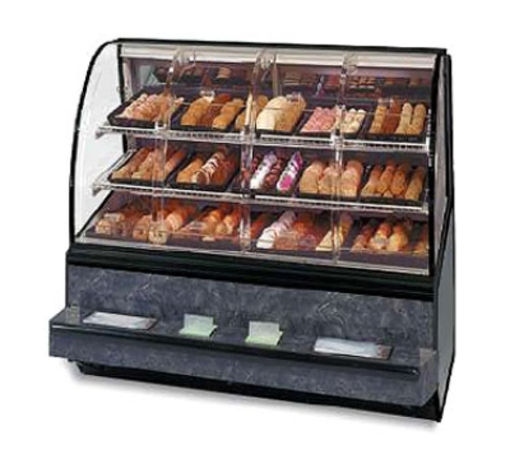 Series ’90 Non-Refrigerated Self-Serve Bakery Case, 77-1/4″W x 37-3/4″D x 48-1/2″H, (4) sets of clear lift-up self-closing front doors, top light & shelf lights, heat reducing vent system, (2) tiers of adjustable white wire shelves, white interior, removable glass sliding rear doors sloped for easy product access, clear ends, black laminate & trim, UL, UL EPH CLASSIFIED
