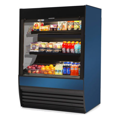 Vision Series Refrigerated Self-Serve High Profile Merchandiser, 47.25″ x 33″ x 60″, square ends, (2) tiers adjustable black metal shelves with price tag molding, stainless steel display deck, black interior back panel, welded powder coated steel base, front air intake / front & rear discharge, R449a refrigerant, 3500K LED top light, night curtain, adjustable leg levelers, electronic temperature controls, thermometer, 208-240v/60/1-ph, 12.5 amps, cord & NEMA 6-20P plug, UL, cUL, UL Sanitation