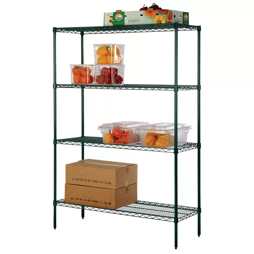 This is a listing for a green epoxy coated shelving kit with 4 – 18″ x 36″ shelves. It comes with 4 – 74″ split posts and is NSF approved.