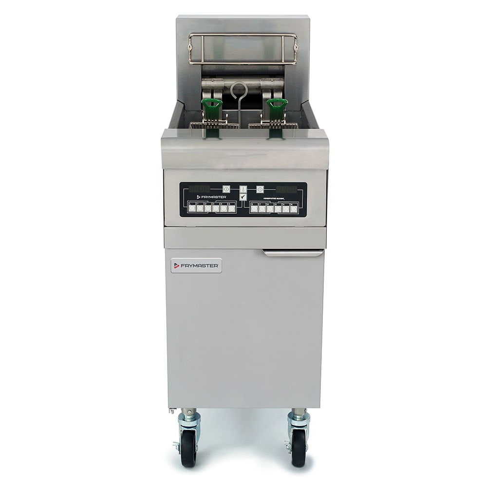 Because it has casters, the Frymaster FPRE114 commercial electric caster can be moved as needed for organization, sanitation, and maintenance. Its doors, cabinets, and frypot are made of stainless steel-a corrosion-resistant metal that defends against common wear from high-volume applications. Its single frypot measures 14 inches long by 151/2 inches wide and has an easy-to-clean, open pot structure. Twin fry baskets fit in the vat, and they can be secured in place on the basket rack and hanger.