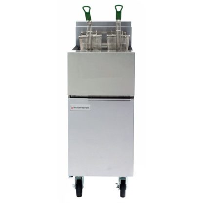 Fryer, NG gas, floor model, 40 lb. capacity, open-pot design, millivolt controls, master jet burner, temperature probe, 1-1/4″ IPS ball type drain valve, includes: rack-type basket support, basket hanger, flue deflector & twin baskets, stainless steel frypot, door & cabinet, legs & casters, 100,000 BTU, NSF, CSA