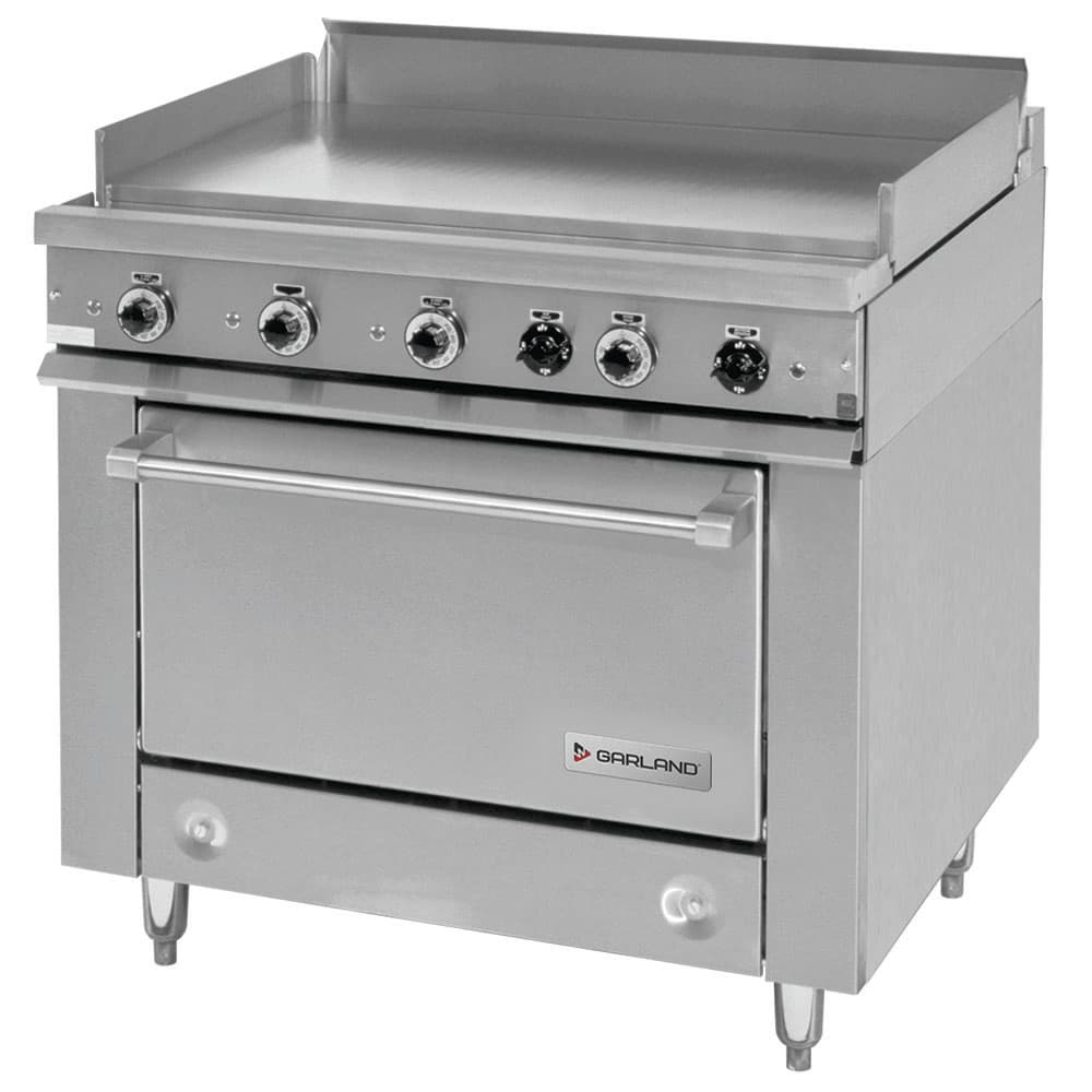 36E Series Heavy Duty Range, electric, 36″, griddle, thermostatic controls, standard oven, 4-position rack glides, (1) rack, 3″ high vent riser, stainless steel front, sides & front rail, 6″ legs, 21.5 kW, cCSAus, NSF (Garland)