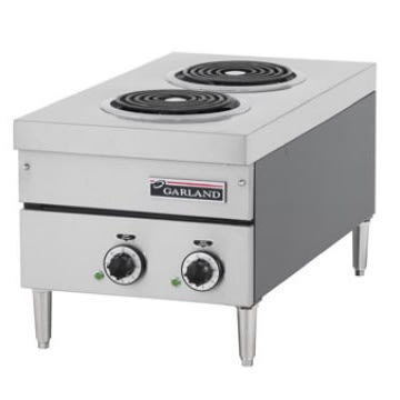 Garland’s E24 series heavy-duty hotplate is designed and engineered for high volume fast food restaurants. This electric hotplate can be used as a freestanding unit or banked with other E24 series equipment or with G24 series gas counter equipment providing flush fronts and backs. Two 8-1/2″ spiral 2.1 kW elements heat up quickly, allowing you to quickly heat sauces, soups, or even boil water for pasta. Elements tilt up, making it easy to remove porcelain spillover bowls for easy cleaning. This commercial hotplate is supported by 4″ legs.