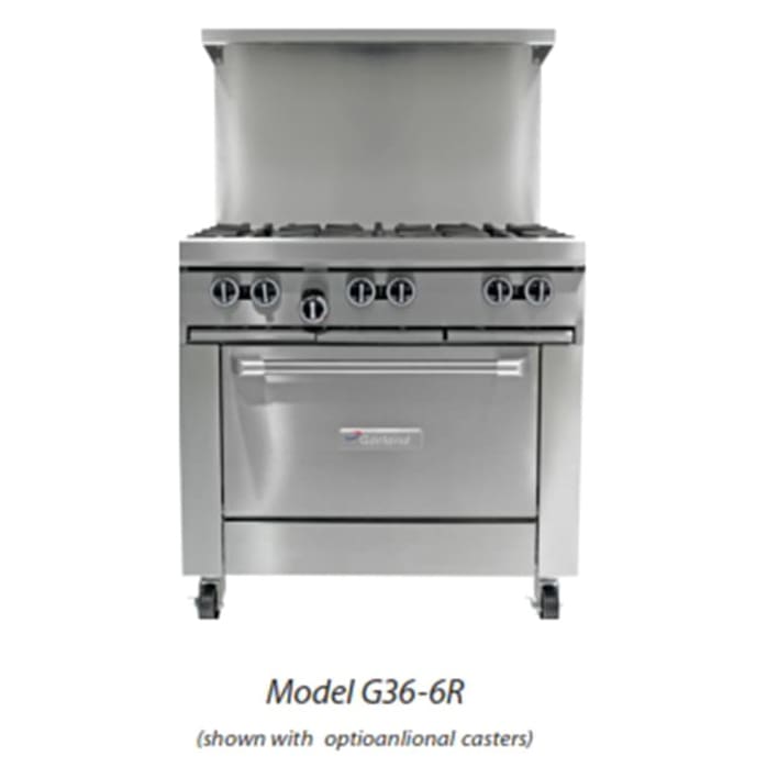 With a large work top surface, the Garland G36-G36R gas range can heat ample amounts of food at once. Measuring 23 inches deep, the griddle has a 5/8-inch-thick plate, and for even heating, it has a burner for every 12-inches of griddle surface controlled by manual valves on the front. This unit comes with a removable shelf for convenient storage, and for convenient cleaning, it includes 12-inch stamped drip trays. A standard oven with a single oven rack adjustable on three positions is featured on this model. The large porcelain interior fits standard sheet pans in both directions, and the temperature is controlled with a snap-action modulating thermostat.