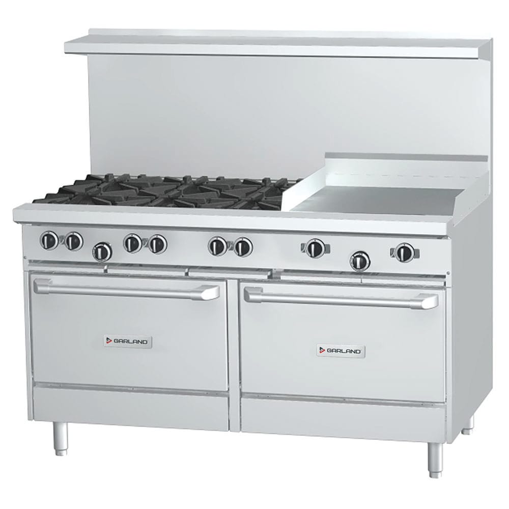 G Starfire Pro Series Restaurant Range, natural gas, 60″, (6) 33,000 BTU open burners, with cast iron top & ring grates, 24″ x 23″ x 5/8″ thick smooth steel griddle plate, (2) standard ovens with 3 position rack guides with oven rack, stainless steel front, sides, plate rail, 2-piece back guard and shelf, 6″ stainless steel legs with adjustable feet, 310,000 BTU, CSA Flame, CSA Star, cCSAus, NSF (Garland)