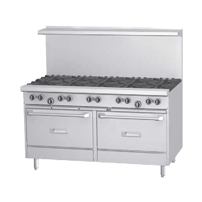 G Starfire Pro Series Restaurant Range, natural gas, 60″, (6) 33,000 BTU open burners, with cast iron top & ring grates, 24″ x 23″ x 5/8″ thick smooth steel griddle plate, (1) standard oven with 3 position rack guides with oven rack, (1) storage base, stainless steel front, sides, plate rail, 2-piece back guard and shelf, 6″ stainless steel legs with adjustable feet, 272,000 BTU, CSA Flame, CSA Star, cCSAus, NSF (Garland)