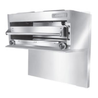 G Series Salamander Broiler, natural gas, 35-1/4″ W, for 60″ Restaurant Range, mounted on 59″ W flue riser with 24″ high shelf (broiler standard on left), (2) 20,000 BTU infrared burners with Hi-Lo valve controls each, (3) position spring balanced rack assembly, removable grease pan, stainless steel top, front, sides, backsplash & bottom with heat shields, 40,000 BTU, NSF