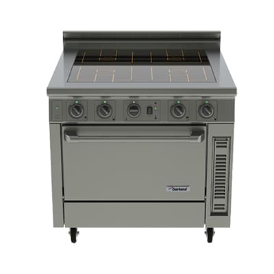 The Garland GME36-120C Master floor model commercial induction range has four induction hobs that each deliver 5 kilowatts. Using an RTCSmp feature, the induction hobs maintain exact temperatures and offer users accurate cooking control. A pan detection feature only heats the hob when a pan is present, conserving energy. If a pan is used dry, the range shuts off to deter overheat.
