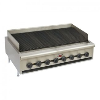 Charbroiler, countertop, 36″ W, heavy-duty, adjustable cast iron grates, 21-3/16″ D broiling grid, (1) variable hi/lo valve per burner, manual controls, crumb tray, reversible cast iron broiler racks in 3″ W sections, stainless steel front, sides, back & 3-1/2″ front rail, 4″ adjustable legs, 108,000 BTU, NSF, CSA