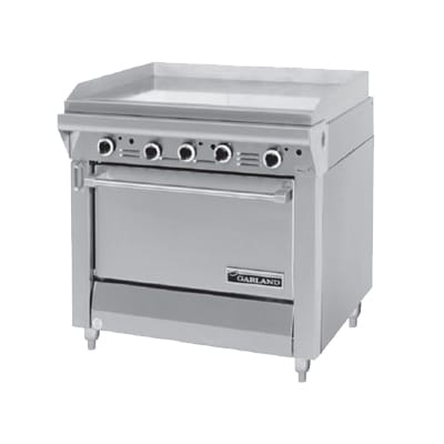 Master Series Heavy Duty Range, 34″, griddle, individual Hi-Lo valve controls, standard oven, piezo ignition, stainless steel front & sides, 6″ legs, 139,000 BTU, CSA Flame, CSA Star, NSF (Garland)