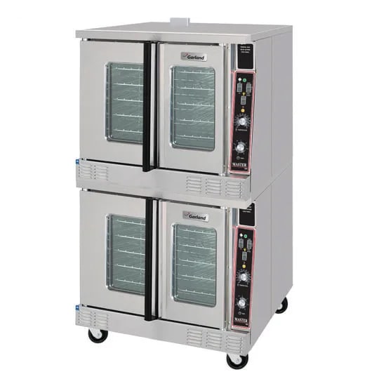 Master Series Convection Oven, natural gas, double-deck, standard depth 41-1/2″, (2) speed fan, Master 200 solid state controls with 1 hour timer, electric ignition, dependent 60/40 doors with windows, stainless steel front, sides & top, porcelain cavity, 24″ cooking cavity height, with (6) chrome plated oven racks on 13-position rack guides, 6-1/2″ legs, EnerLogic Technology, 120,000 BTU (Garland), UL, cUL, NSF, ENERGY STAR qualified model