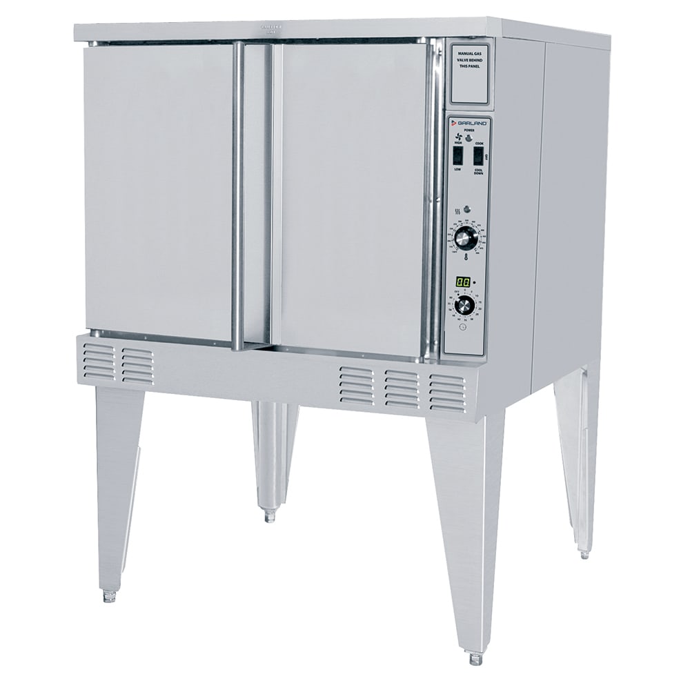 Built with stainless steel parts, this Garland SCO-ES-10S electric convection oven endures heavy-duty use. Its 251/2-inch-tall legs ensure the cooking chamber is within reach, while the dependent doors provide convenient, one-handed access. For reliability, this unit features solid-state controls and an electromechanical timer, and for simplicity, its settings are adjustable with knobs on the front.