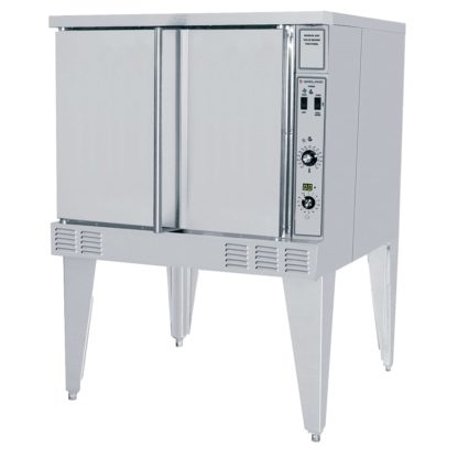 SunFire Convection Oven, single-deck, solid state controls with 150° – 500° F, solid state thermostat, 60 minute timer, (5) chrome plated oven racks per deck, electronic spark ignition, dependant 60/40 doors, stainless steel front, sides, top, 25-1/2″ legs, porcelain cavity, 53,000 BTU, UL, cUL, NSF