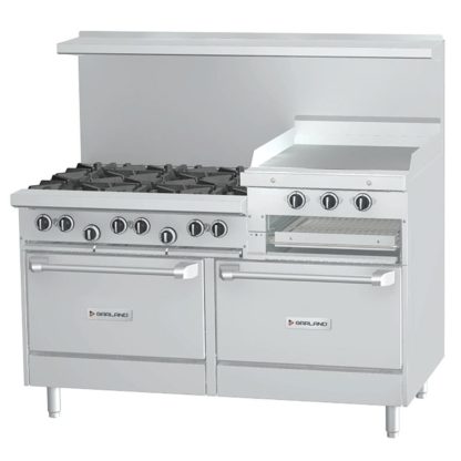 U Series Restaurant Range, 36″, (2) 32,000 BTU open burners, (1) 24″ griddle, 5/8″ thick smooth steel plate, standard oven, (1) oven rack, 3 position rack guides, stainless steel front, sides, plate rail, 2-piece back guard & shelf, 6″ stainless steel legs, adjustable feet, 138,000 BTU, CSA Flame, CSA Star, cCSAus, NSF (US Range)