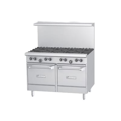U Series Restaurant Range, 48″, (8) 32,000 BTU open burners, with cast iron top & ring grates, (2) space-saver ovens with 3 position rack guides with oven rack each, stainless steel front, sides, plate rail, 2-piece back guard and shelf, 6″ stainless steel legs with adjustable feet, 320,000 BTU, CSA Flame, CSA Star, cCSAus, NSF (US Range)