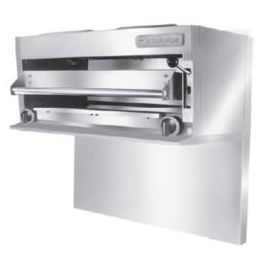 Salamander Broiler, 35-1/4″ W, for 60″ Restaurant Range, mounted on 59″ W flue riser with 24″ high shelf (broiler standard on left), (2) 20,000 BTU infrared burners with Hi-Lo valve controls each, (3) position spring balanced rack assembly, removable grease pan, stainless steel top, front, sides, backsplash & bottom with heat shields, 40,000 BTU, NSF