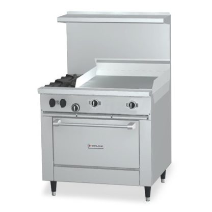 Sunfire Restaurant Range, 36″, (2) 30,000 BTU open burners, (1) 24″ griddle, 5/8″ thick steel plate, cast iron top & ring grates, standard oven, (1) oven rack, 2 position rack guides, stainless steel front, sides, plate rail, backguard, & high shelf, 6″ steel core legs, 129,000 BTU, NSF, CSA