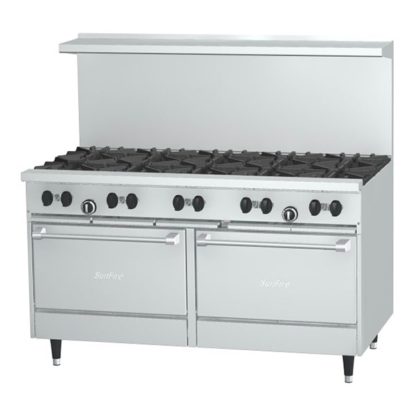 Sunfire Restaurant Range, 60″, (10) 30,000 BTU open burners, with cast iron top & ring grates, (2) standard oven with 2 position rack guides with oven rack each, stainless steel front, sides, plate rail, backguard, & high shelf, 6″ steel core legs, 366,000 BTU, NSF, CSA