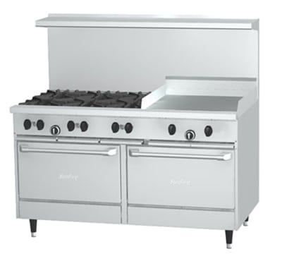Sunfire Restaurant Range, 60″, 24″ griddle with 5/8″ thick steel plate, (6) 30,000 BTU open burners, with cast iron top & ring grates, (2) standard ovens with 2 position rack guides with oven rack each, stainless steel front, sides, plate rail, backguard, & high shelf, 6″ steel core legs, 286,000 BTU, NSF, CSA