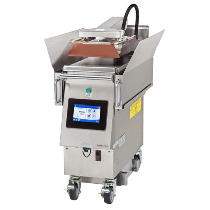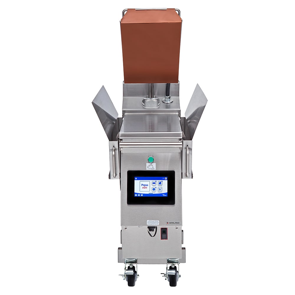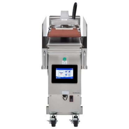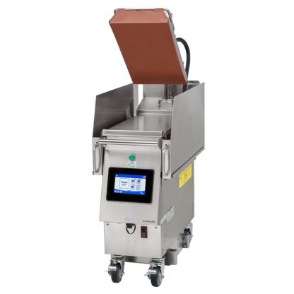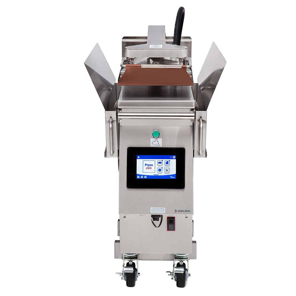 The Garland XPE12 XPress commercial press griddle uses two plates to sandwich food products, cooking them on both sides for quick grilling. Its top platen is raised and lowered quietly via a lift system, which adjusts automatically to ensure grilling quality. The bottom plate is made of 3/4-inch carbon steel; heat-up and recovery times are much faster than thicker plates, though it doesn’t hold heat quite as well.