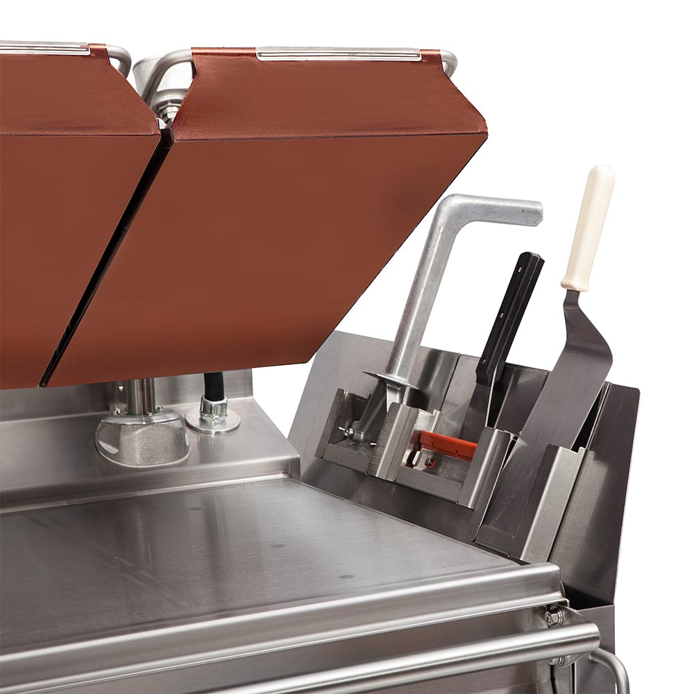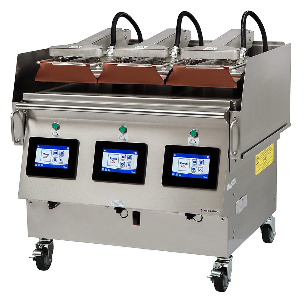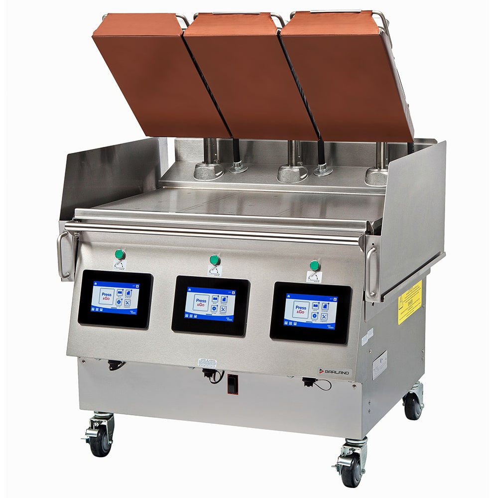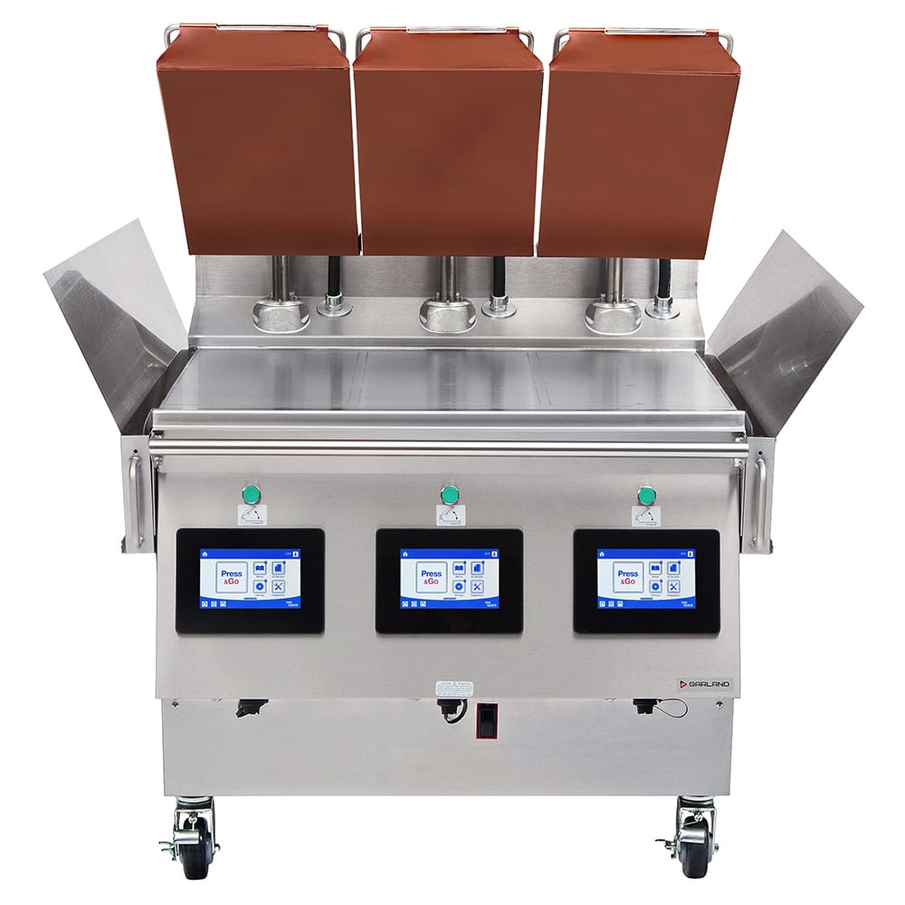 The Garland XPE36 XPress commercial clam shell griddle’s 3/4-inch carbon steel bottom plate has heating and recovery superior to thicker plates, though it doesn’t retain heat as well. Using top and bottom plates, the unit optimizes cook time by grilling food products on both sides at a time. The top plates are raised and lowered automatically by a low-noise lift system. Programmable controls and a USB interface equip the Garland XPE36 press griddle to provide various functions, from independent cooking zones to menu updates. Side-mounted grease pans collect food juice and other residue from the griddle plate, and splash guards channel residue into the pans. For resilience and dent resistance, the griddle uses extensive stainless steel in its construction.