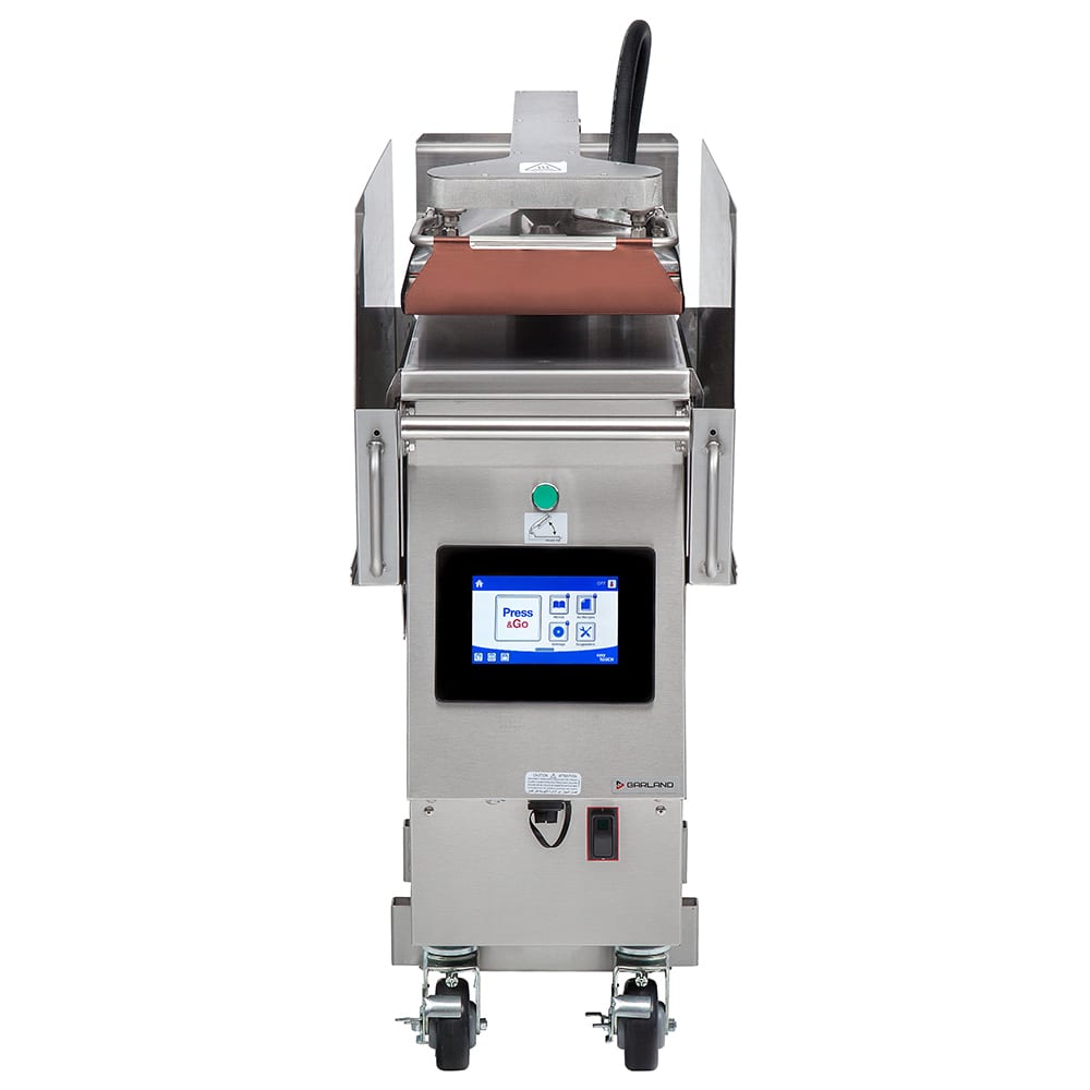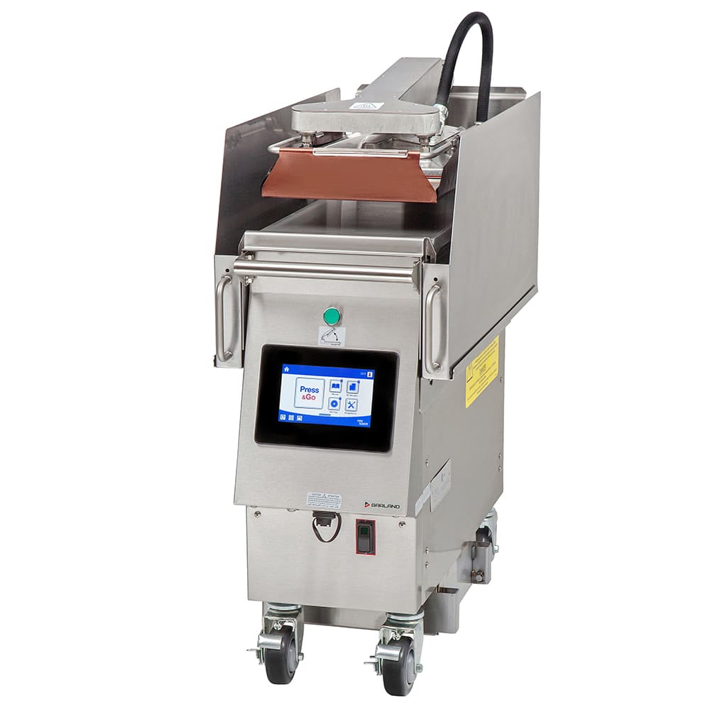 The Garland XPE12 XPress commercial press griddle’s two plates cook both sides of food at the same time, decreasing the time chefs spend on each order. The top platen adjusts automatically with a lift system to cook different products. A 3/4-inch carbon steel bottom plate has good heat up and recovery times, though it doesn’t hold that heat as well as thicker plates.