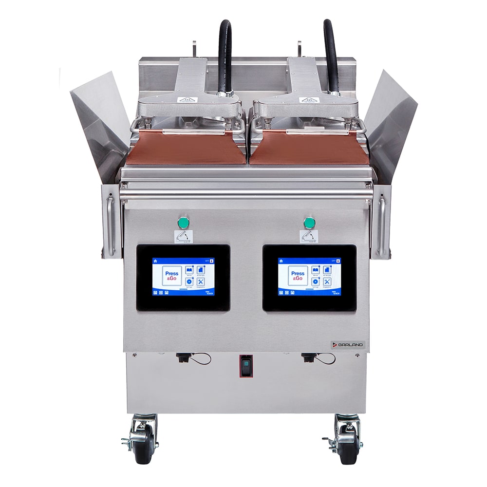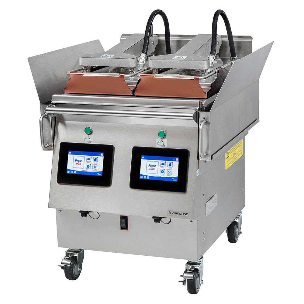 Equipped with touchscreen controls, operators of the Garland XPG24 X-Press gas griddle can adjust the temperature, time, and cooking gap to ensure best results. Because all seven heating elements-two on each platen and three on the plate-are individually controlled, users can cook eggs on one side and burgers on the other. To prevent temperature overshooting and undershooting, this griddle uses smart anticipation and advanced temperature control, while an automatic diagnosis feature informs users of any problems so they can fix them quickly.