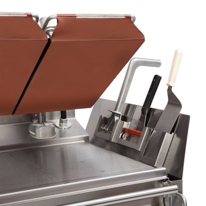 X-Press Flat Griddle, gas, two platens, 23-3/4″ W x 22″D griddle plate, 3/4″ thick carbon steel griddle plate, die cast aluminum top heating elements, EasyTouch screen programmable controls with USB interface, towel bar with bun pan lip, stainless steel dual side grease collectors, stainless steel front, top & sides, (4) casters with front brakes, 40,000 BTU (contact factory for price) IPX4, CSA, CSA Star, CSA Flame, NSF