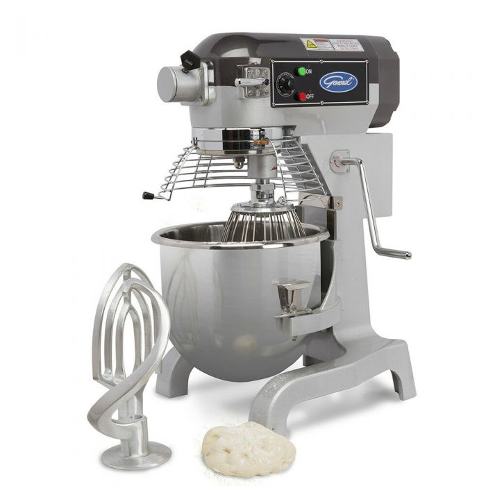 General 20-Quart all-purpose mixer uses a planetary mixing action that consistently blends, mixes, and aerates all ingredients. Comes with a stainless steel bowl, flat beater, spiral dough hook, and wire whip. Stainless steel wire front bowl guard opens easily for adding ingredients. The bowl guard magnetic lock prevents the mixer from running if guard is opened or the bowl is lowered. Switches are moisture-resistant and the mixer comes with an overload switch that protects the motor.