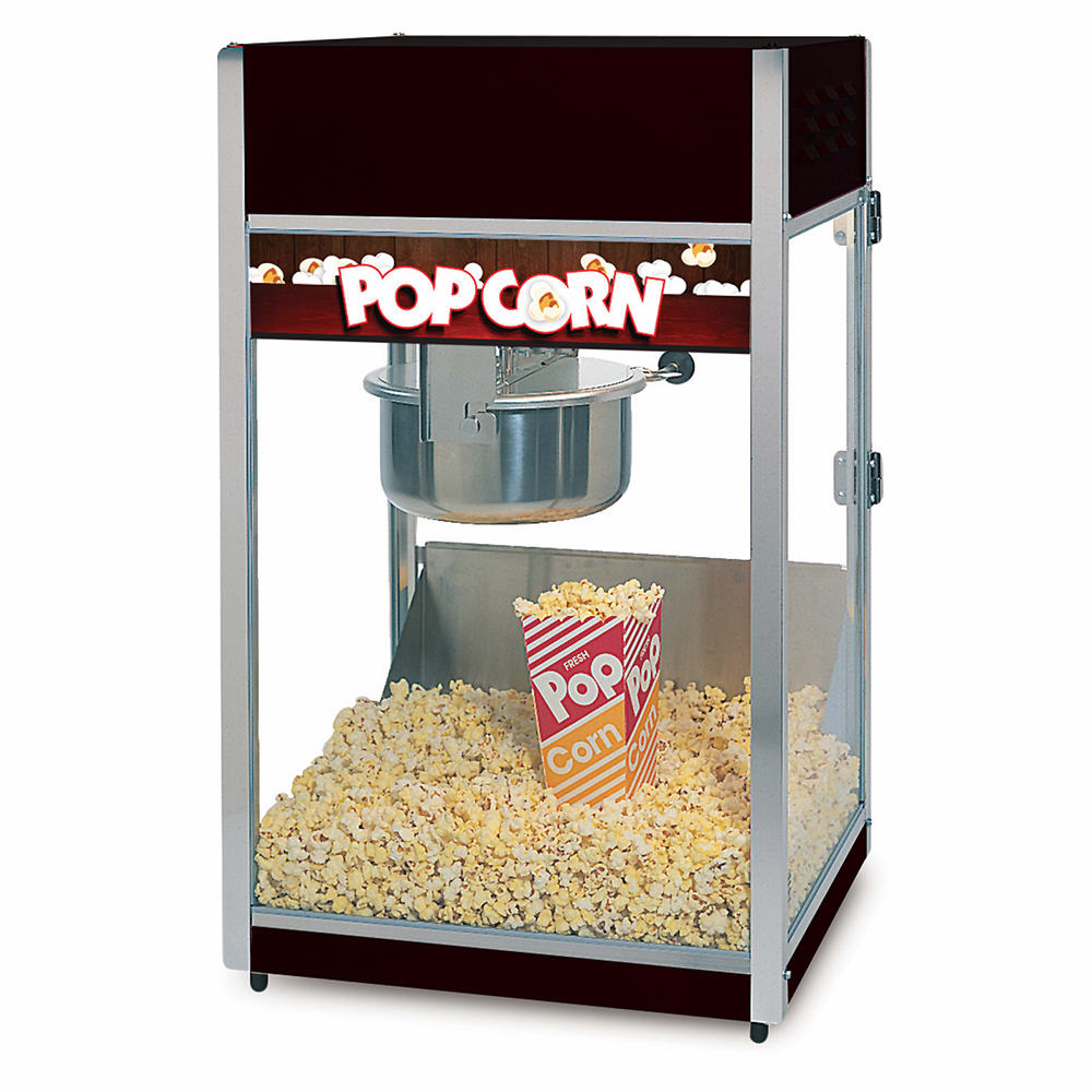 Popcorn Popper, 8 oz., (160) 1 oz. servings per hour, crumb tray, tempered glass, heated deck, removable kettle, tubular heating elements, 120v/60/1-ph., 12.7 amps, 1525 watts, NEMA 5-15P, NSF, cULus