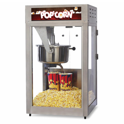 Popcorn Popper, 16 oz., (320) 1 oz. servings per hour, crumb tray, tempered glass, heated deck, removable kettle, tubular heating elements, 120v/60/1-ph., 14.3 amps, 1710 watts, NEMA 5-15P, NSF, cULus