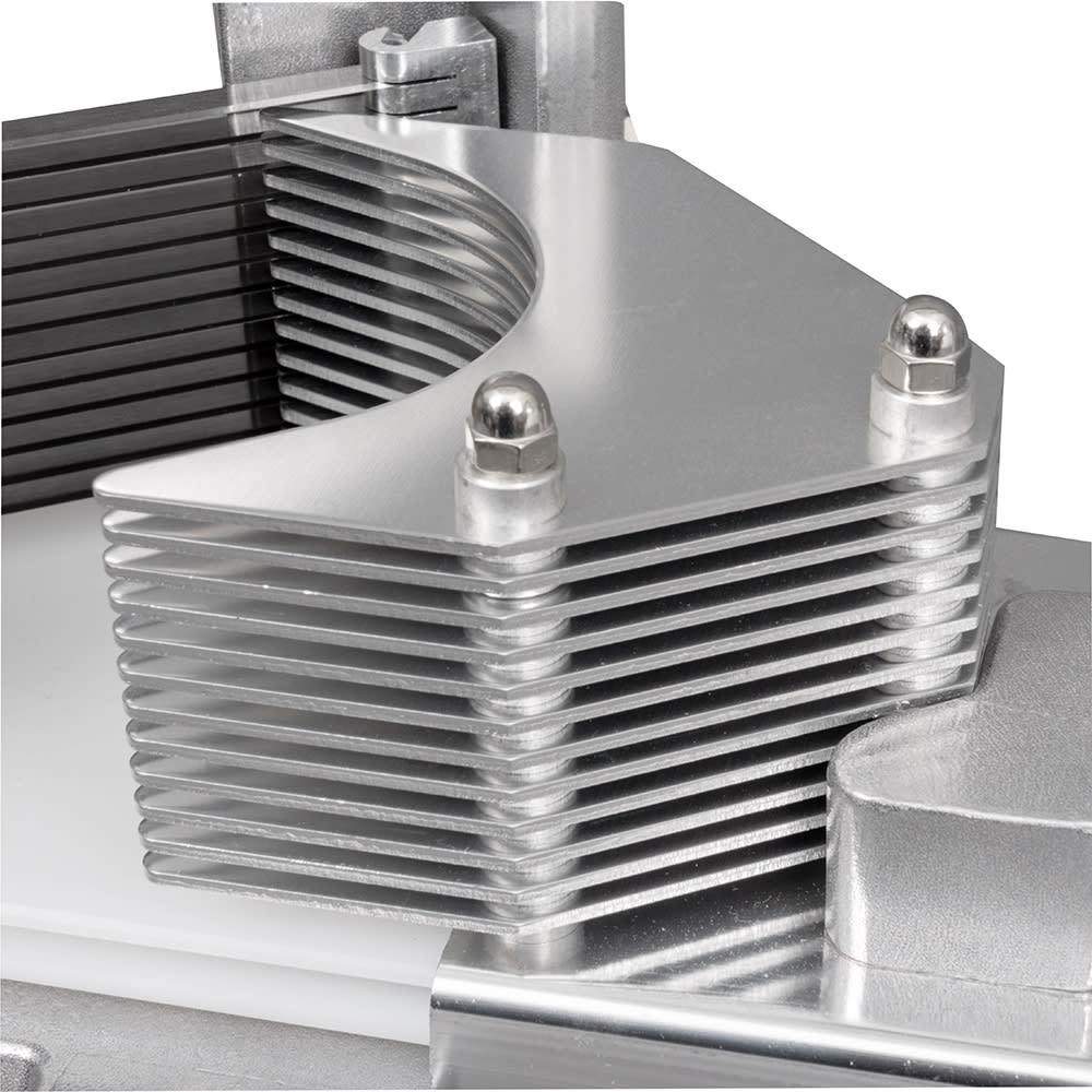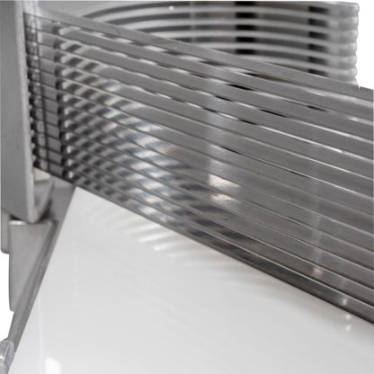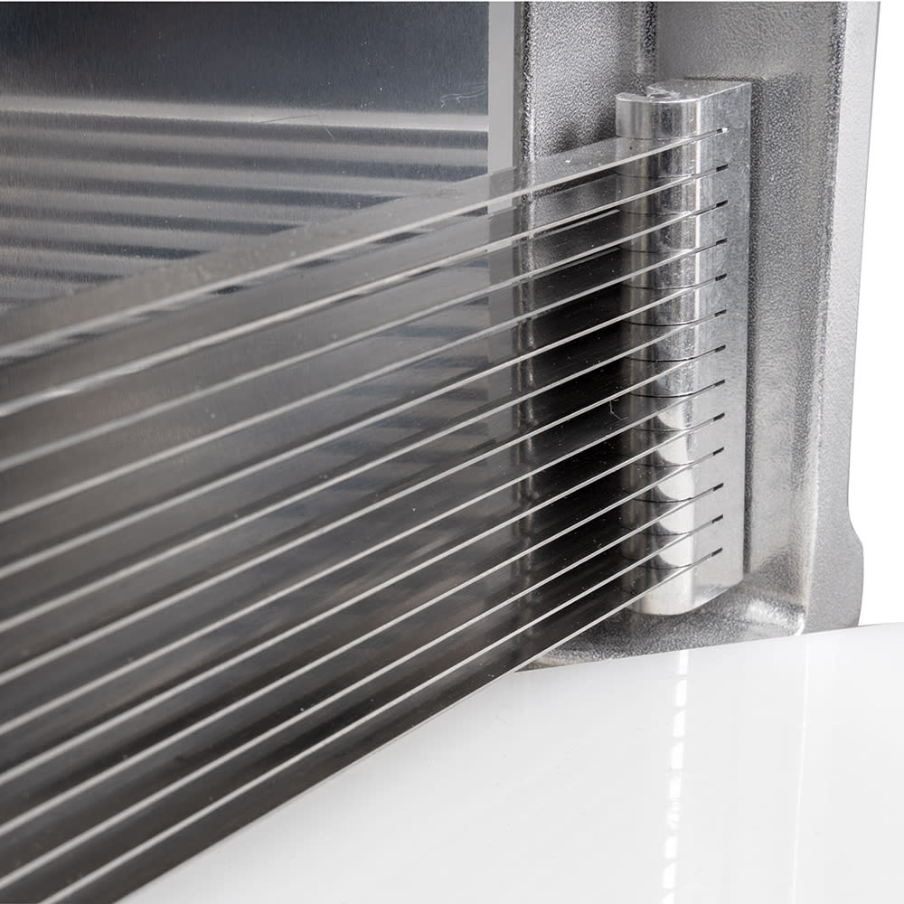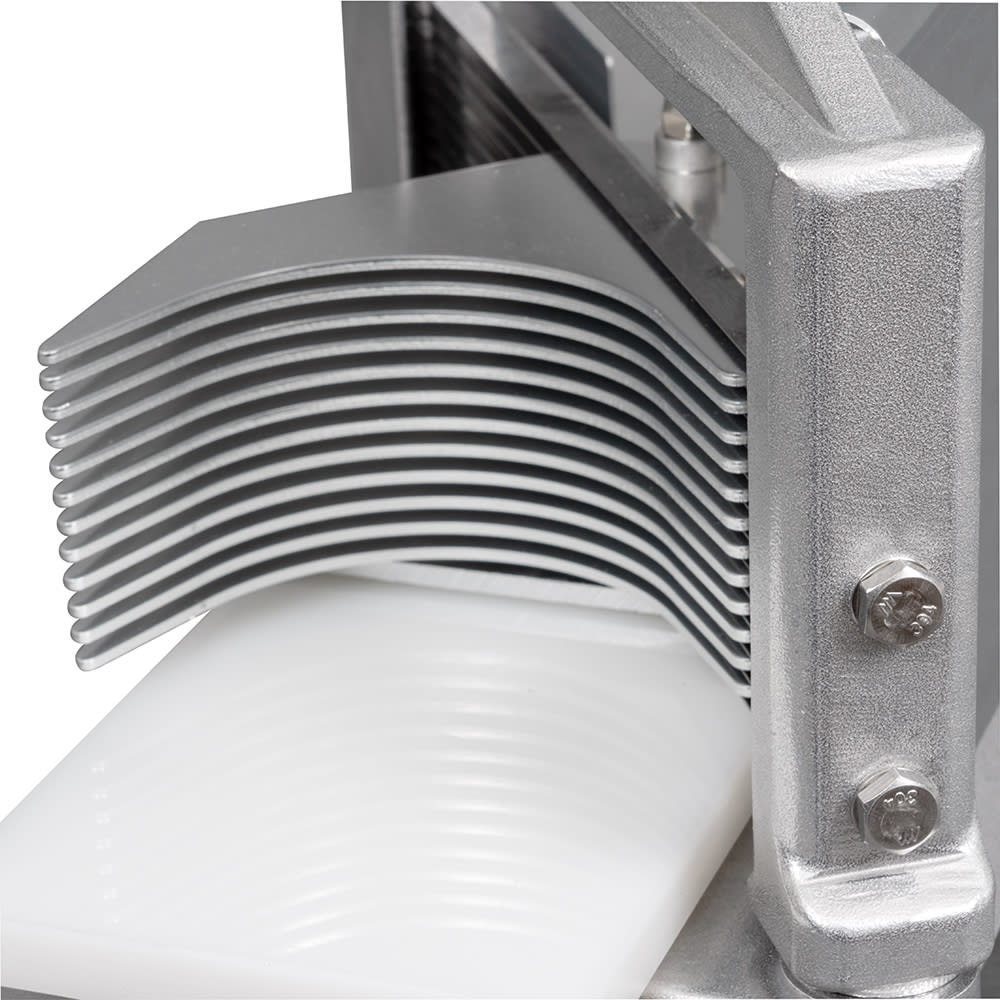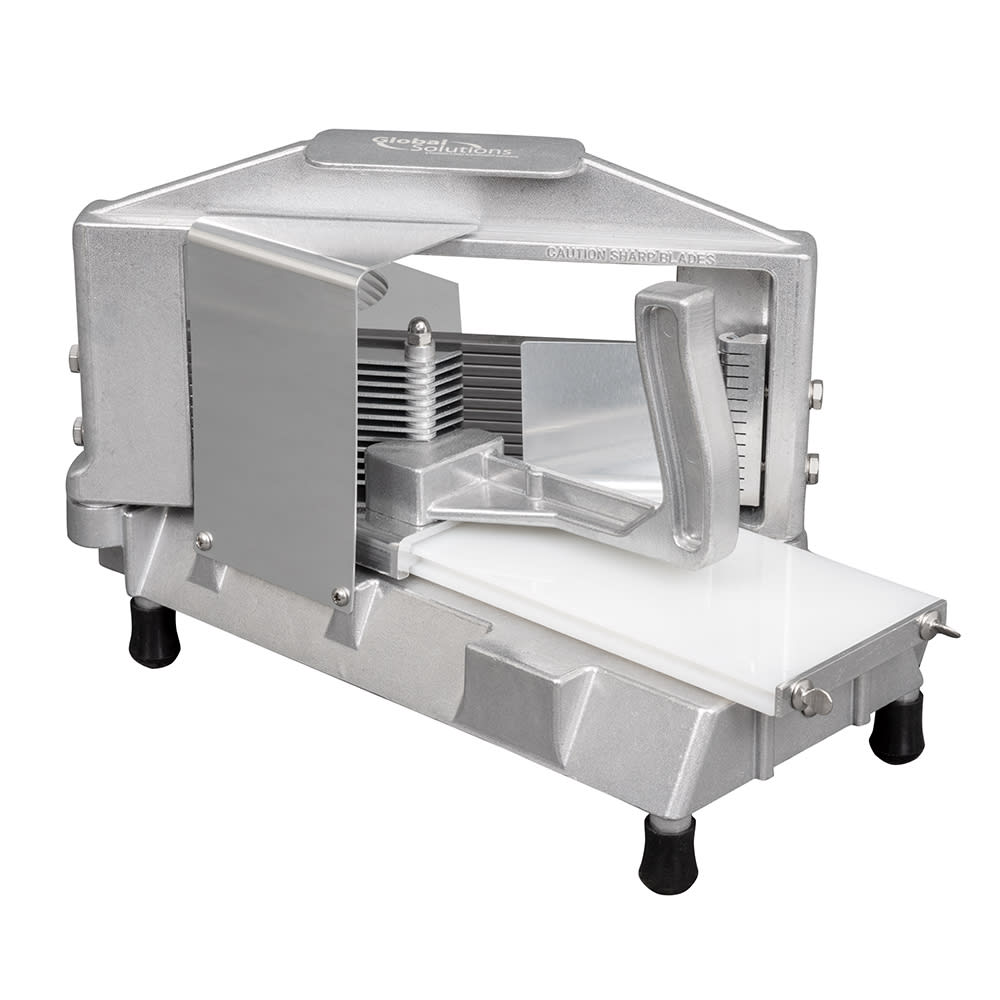 The Global Solutions GS4100-A tomato slicer pushes tomatoes through a series of blades that cut the tomato into uniform, 3/16-inch slices. Because the slicer operates manually, it is intuitive to control. The operator can place a tomato on the slide board between the pusher assembly and slicing blades. When ready, the user can push forward the pusher handle, moving the tomato into the blades. Users can slice tomatoes directly into a pan or catch them with their hand. Made of aluminum, the body is durable and corrosion resistant while non-skid feet help keep the unit stable on countertops.