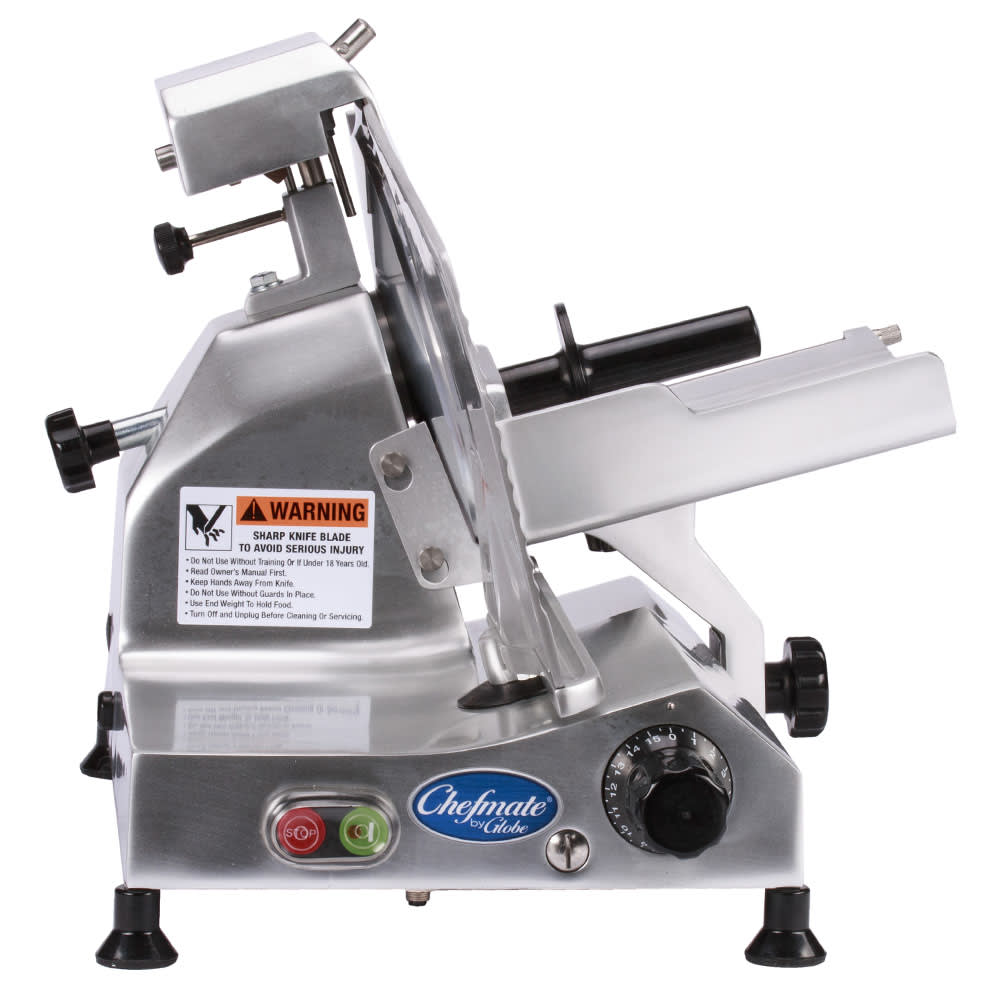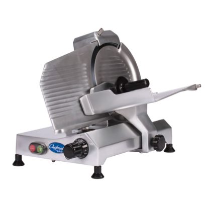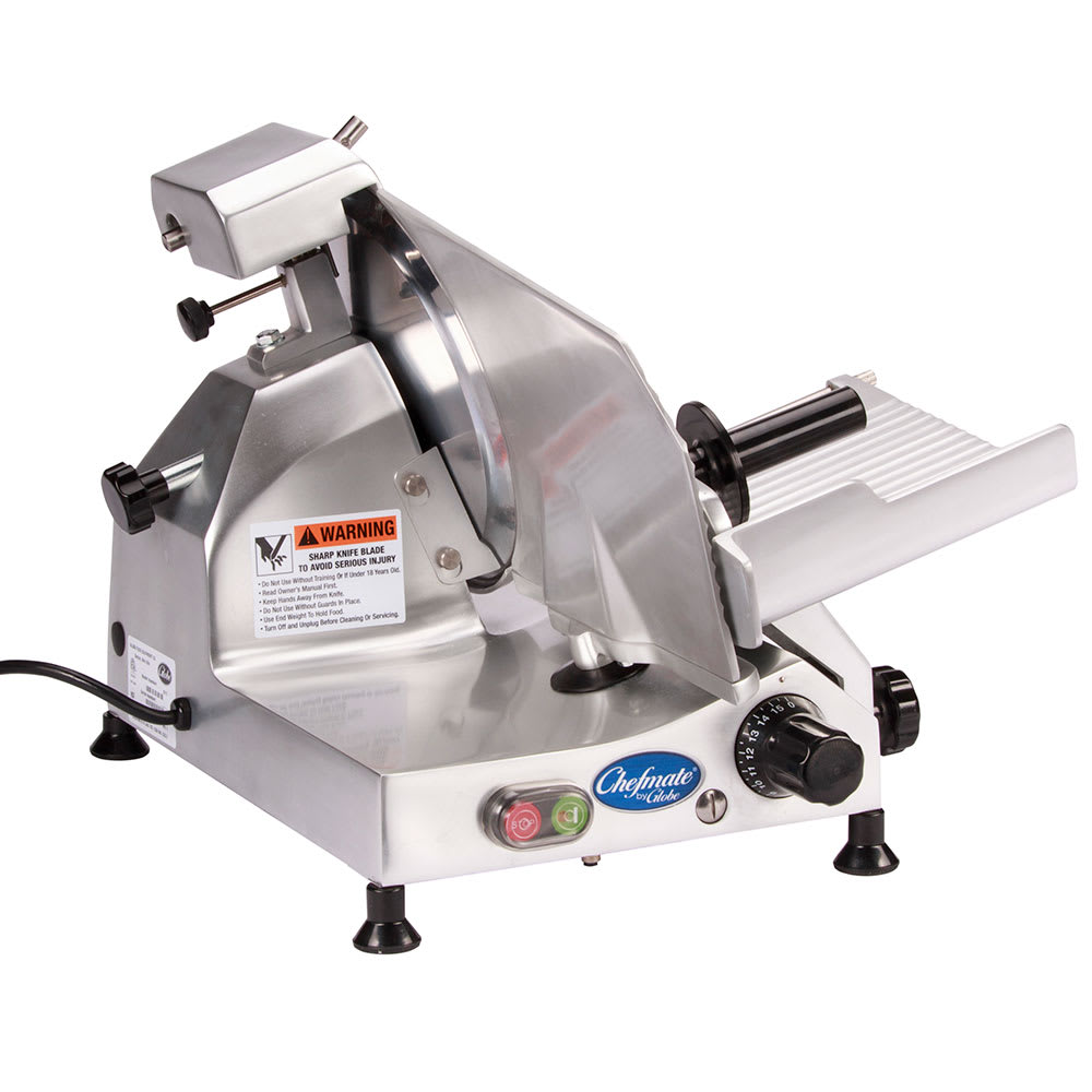 Chefmate Food Slicer, manual, 10″ diameter knife, 0″ to 9/16″ slice thickness, removable gravity feed food chute, top mounted sharpener, slice deflector and knife cover, belt-driven, chute slide system, anodized aluminum, rubber feet, 1/4 HP, 115v/60/1, 2.5 amps, NEMA 5-15P, cETLus, ETL-Sanitation