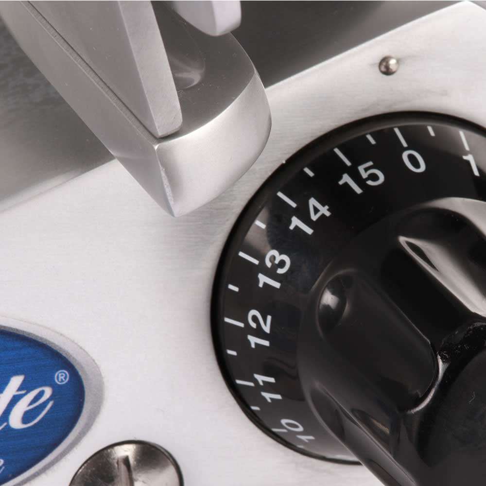 A dual-action knife sharpener is mounted at the top of the Globe C10 food slicer, so users can keep the edge of the blade sharp. For simple cleaning, the food chute, slice deflector, and knife cover can all be removed. Because this slicer is mounted on rubber feet, it won’t slip on the counter during use.
