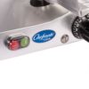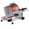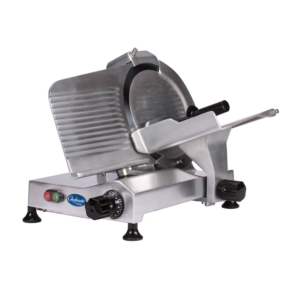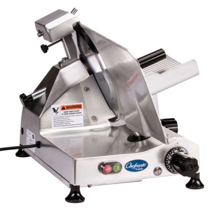 Chefmate Food Slicer, manual, 12″ diameter knife, 0″ to 9/16″ slice thickness, removable gravity feed food chute, top mounted sharpener, slice deflector and knife cover, belt-driven, ball bearing chute slide system, rubber feet, anodized aluminum, 1/3 HP, 115v/60/1, 3 amps, NEMA 5-15P, cETLus, NSF (NSF/ANSI 8-2010)