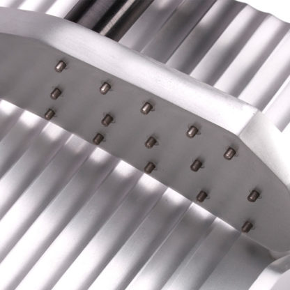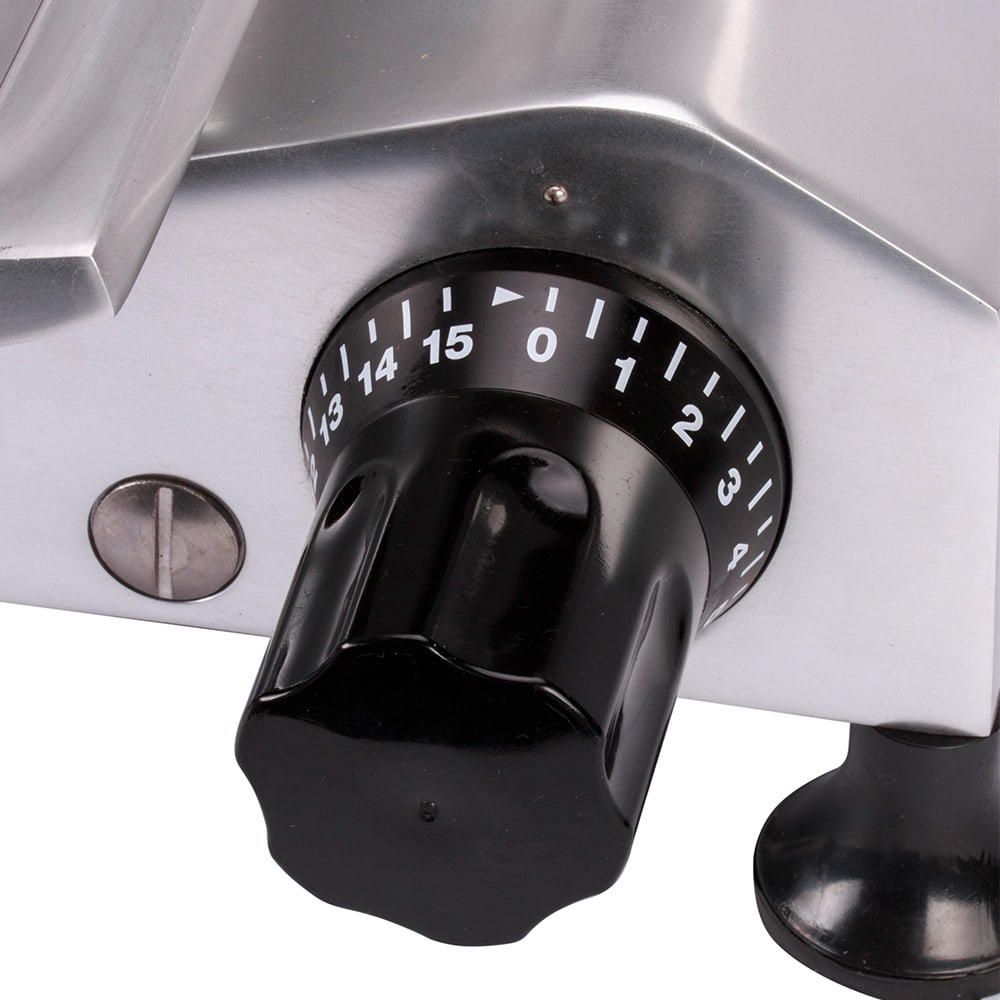 This Globe C12 food slicer’s space-saving design is compact and lightweight, while the top-mounted knife sharpener is sturdy, accessible, and removable. To create a razor-sharp cutting edge, the dual-action sharpener has two stones. For cleaning, this unit’s slice deflector, food chute, and knife cover are removable. Its power switch and knife hub are moisture resistant, and the sealed splash zones enhance sanitation.