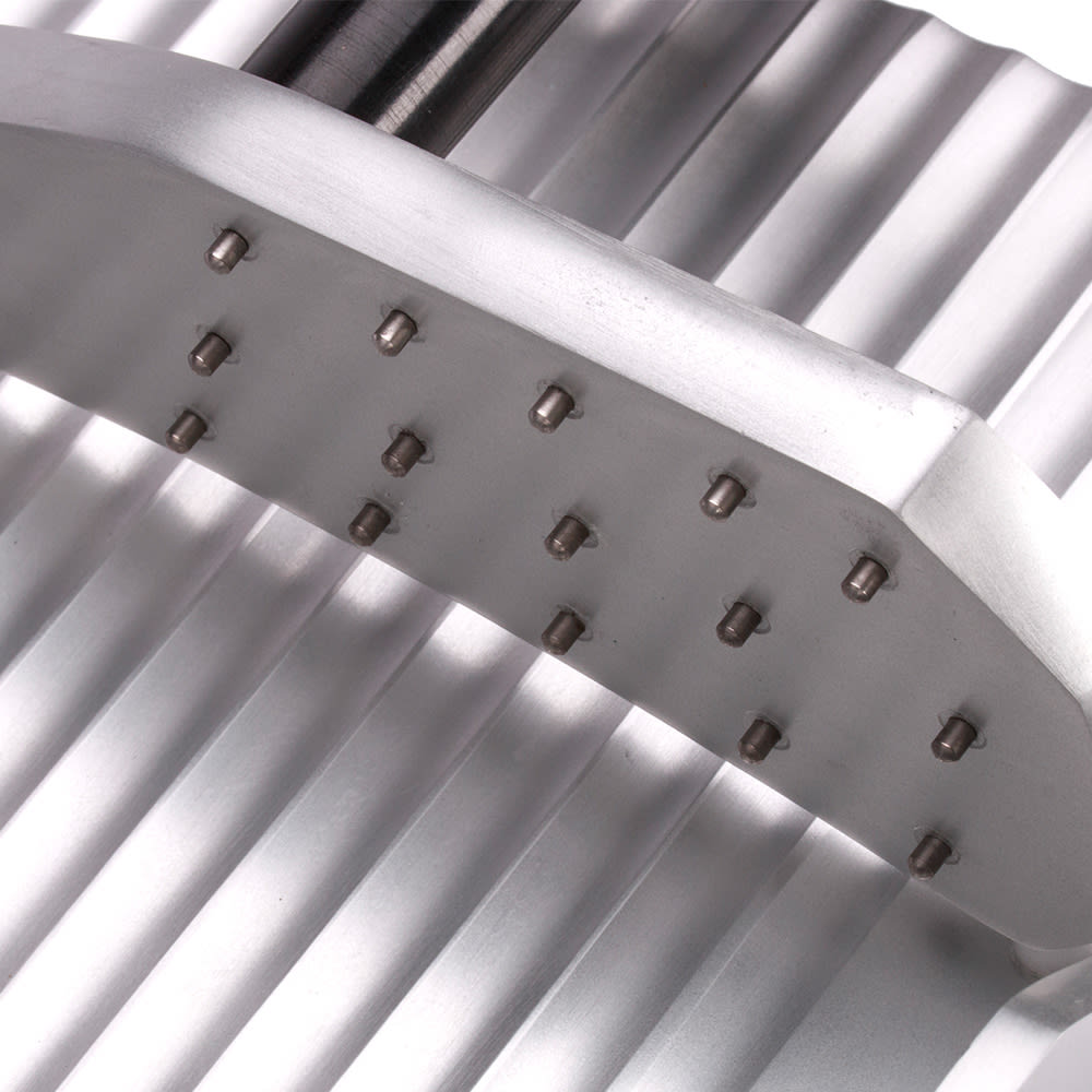 The Globe C12 manual food slicer is equipped with a durable 12-inch hard chromed knife that eases sharpening, cutting slices as thick as 9/16 inch. Its knife motor is cooled by fans, and if it gets too hot, the overload protection shuts it off until it manually resets. To reduce maintenance, the ball bearings are permanently lubricated. Operating the slicer is user friendly with its smooth, ball-bearing chute slide, and the stain-resistant anodized aluminum finish eases cleaning.