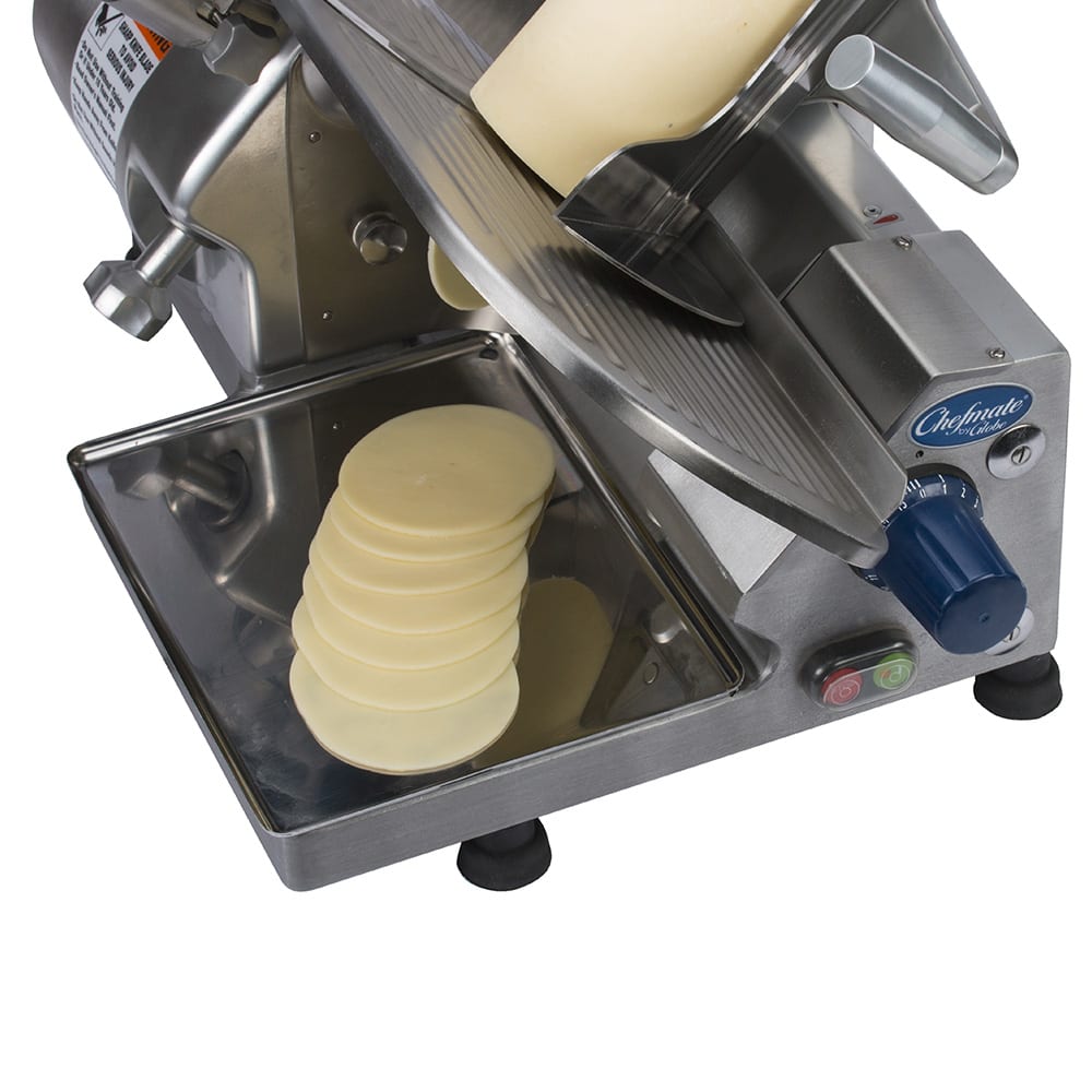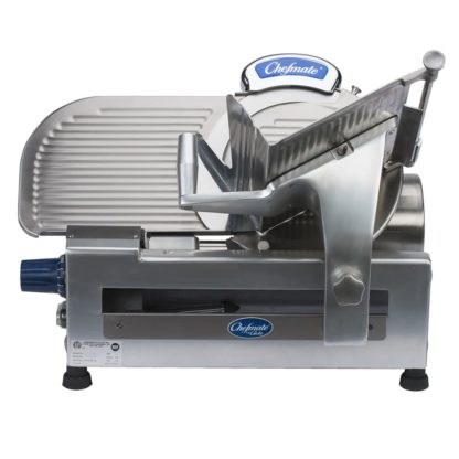 Chefmate Series Medium Duty Compact Slicer, manual, 12″ diameter knife, top mounted sharpener, gear-driven, knife ring guard, knife cover interlock, stainless steel food contact areas, anodized aluminum base, 1/3 HP, 115v/60/1-ph, 4.8 amps, NEMA 5-15P, cETLus, NSF