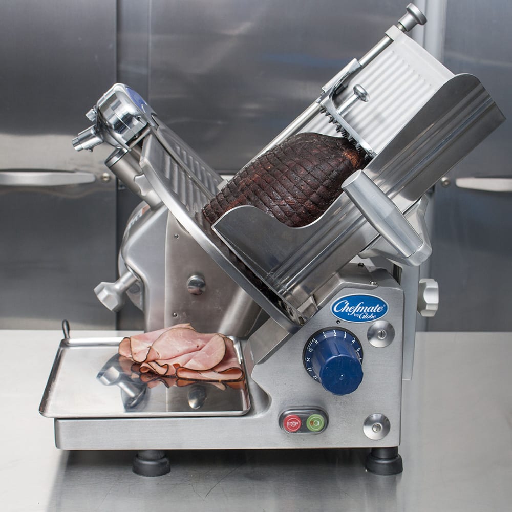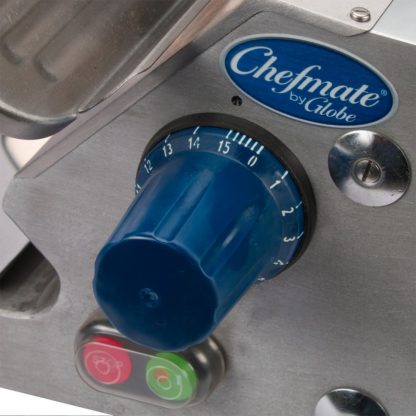 The Globe GC512 Chefmate compact slicer has a gear-driven motor that supports high-volume applications and cuts through dense products. It can slice as many as 6 hours each day, while the stainless steel, high-torque blade slices product to a maximum 7/8 of an inch thickness. When the knife cover is not in place, the interlock prevents operation for added safety. A sharpening tool with two stones and a dual-action motion is built into the slicer for simplified sharpening. Facilitating the cleanup process, the base on this Globe GC512 Chefmate is stain-resistant anodized aluminum.